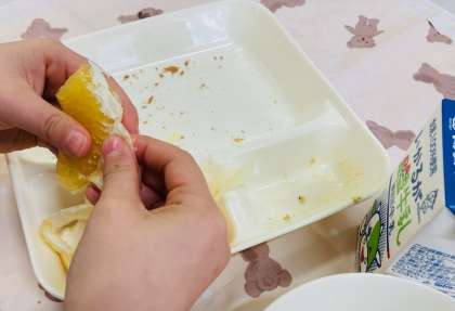 (写真下)薄皮の袋を開いて、じょうずに果肉の部分を食べていました。