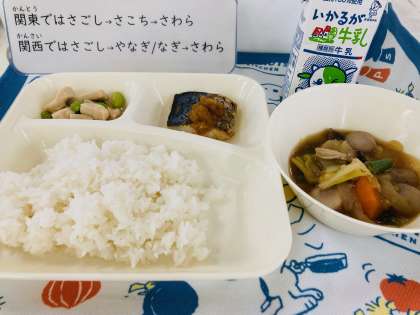 今日の献立は「さごしのおろしじょうゆかけ、さといもと野菜の含め煮、高野どうふの煮もの、ごはん、牛乳」でした。
