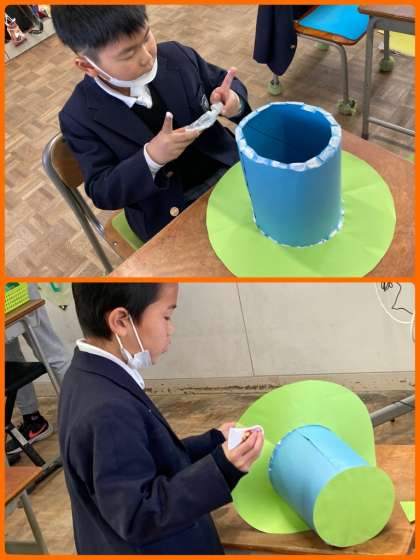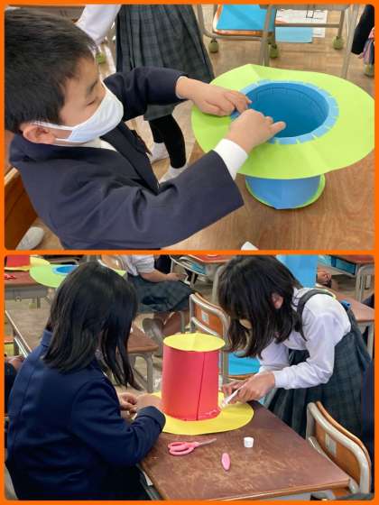 2年生として最後の図工の学習で、おしゃれな帽子を作っています。タッチボンドで丁寧にパーツを貼り付けながら進めています。本体が完成したら、飾りを付けたり色を付けたりします。どんな作品が完成するか楽しみです。
