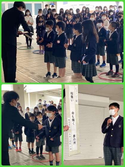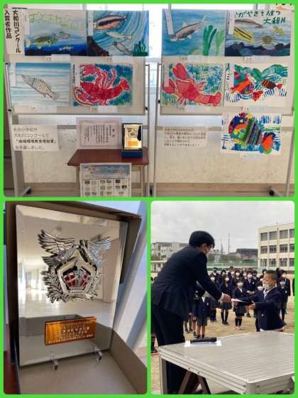 3学期も様々な表彰状が届きました。朝会で、副校長先生から賞状を渡してもらいました。絵画コンクールやこども句会などで、名誉ある賞も獲得しています。学校全体としても、大和川コンクールで「地域環境教育奨励賞」を受賞しました。写真でご覧のように、立派な盾も届いています。