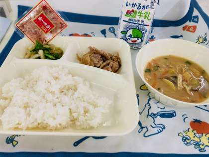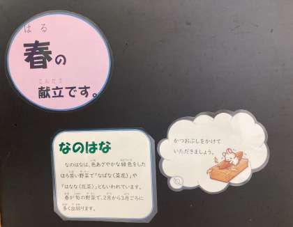 今日の献立は「豚肉のしょうが焼き、さつまいものみそ汁、なのはなのおひたし、ごはん、牛乳」でした。【なのはな】は、「なばな(菜花)」や「はなな(花奈)」ともいわれます。1月から3月に旬を迎え、ほろ苦さに特徴がある緑黄色野菜です。葉が黄緑色でやわらかい在来種(和種)と、葉の色が濃く厚みがある西洋種があります。