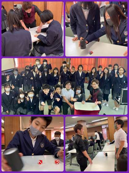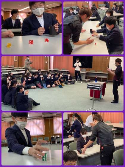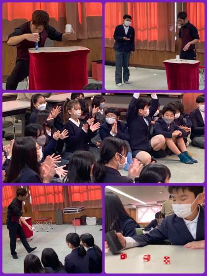 6年生は卒業前の最後のキャリア教育で、ダイススタッキングのパフォーマー「すごろくさん」を招待した特別授業を行いました。驚くようなすご技の連続に、みんな圧倒されていました。なかなか披露されることのない秘技まで見せてもらい、大歓声があがりました。