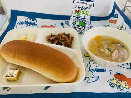 今日の献立は「豚肉のデミグラスソース、スープ、カリフラワーとコーンのサラダ、コッペパン、バター、牛乳」でした。