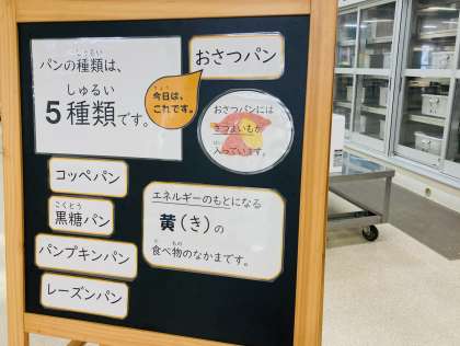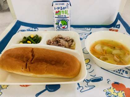 今日の献立は「豚肉のガーリック焼き、スープ、さんどまめとコーンのサラダ、おさつパン、牛乳」でした。