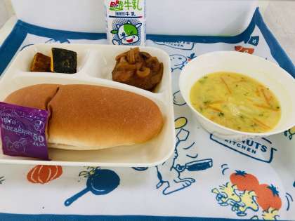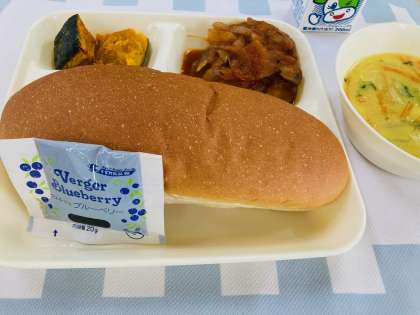 今日の献立は「煮こみハンバーグ、コーンとキャベツのスープ、焼きかぼちゃ、コッペパン、ブルーベリージャム、牛乳」でした。毎日の給食は、成長期に必要な栄養素をバランスよくとること以外にもいろいろなことを学ぶことができます。