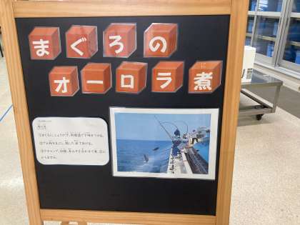 今日の献立は「まぐろのオーロラ煮、豚肉と野菜の煮もの、キャベツの赤じそあえ、ごはん、牛乳」でした。
