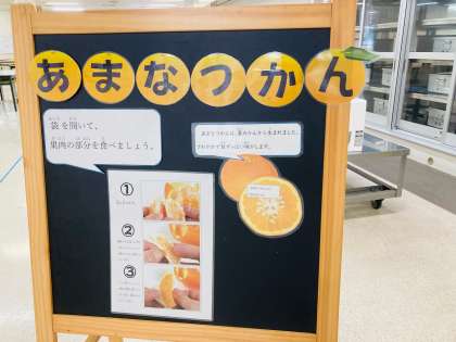 あまなつかんは、夏みかんから生まれました。さわやかで甘ずっぱい味がします。上手に薄皮を取り除き、甘ずっぱさをあじわいました。