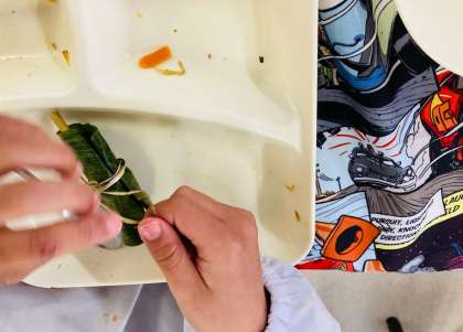 ちまきを食べ終わった後は、葉を重ね、丸めてひもでむすび「ごみをできるだけ小さくかたづける」にチャレンジしました。おかたづけ名人です。