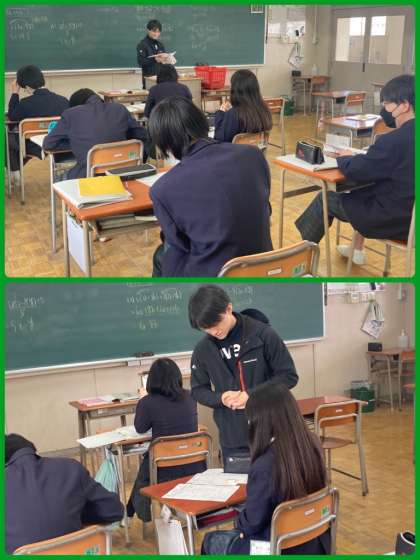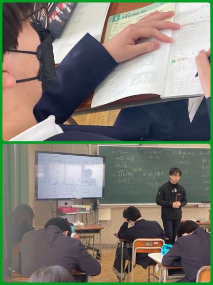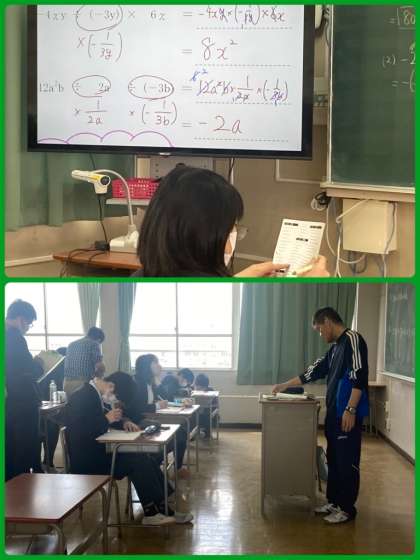 8年生は数学で、一次式のいろいろな計算について学んでいます。かっこがある式は、分配法則を使って計算するように考えています。繰り返し練習問題を解いて、法則を柔軟に活用できるようにしていきましょう。