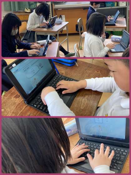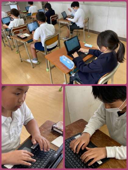 4年生は、1人1台のタブレット端末を使って、タイピング練習をしています。学習したローマ字を、正しい指使いで素早く打鍵できるようにがんばっています。