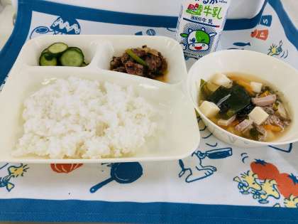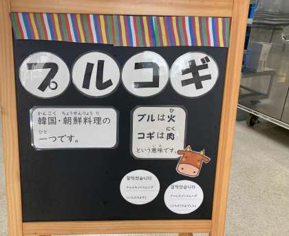今日の献立は「プルコギ、とうふとわかめのスープ、きゅうりの甘酢づけ、ごはん、牛乳」でした。プルコギは韓国・朝鮮料理の一つです。プルは「火」、コギは「肉」という意味です。
