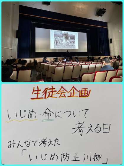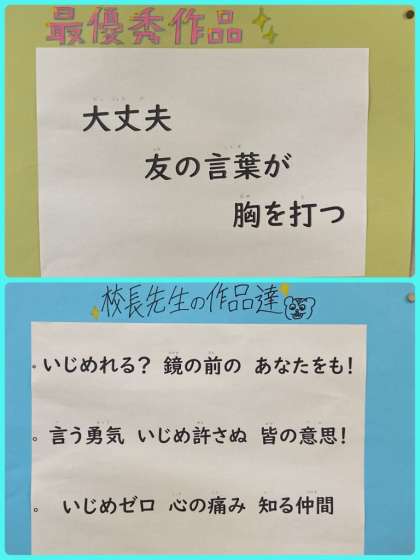 生徒会の提案で、いじめ防止川柳をみんなで考えました。最優秀作品と校長先生の作品は、ピロティ横の階段を上がったところに掲示しております。一人ひとりが、いじめを許さない気持ちをもち、命の大切さを強く意識してほしいと思います。