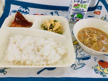 今日の献立は「あかうおのしょうゆだれかけ、みそ汁、えんどうの卵とじ、ごはん、牛乳」でした。旬の食材【えんどう】は、さやから取り出し、鶏ひき肉を加えて、おだしの効いた卵とじにしていただきました。卵の個別対応献立でした。
