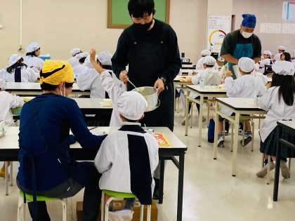(写真:中、下)おとなりの3年生や、多目的室で喫食している7・8年生も、おかわりにたくさんの手があがっていました。