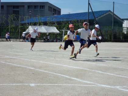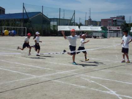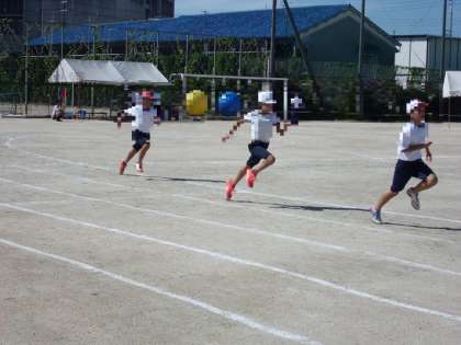 小学生による「徒競走」〜5・6年生が、そして3・4年生が走りました。昨年より力強い走りになっていると評価していただきました。みんながんばっていました!