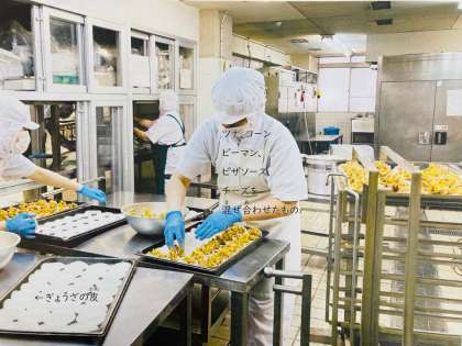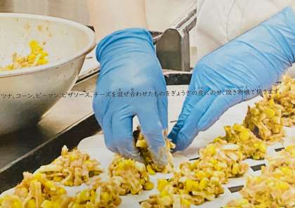 給食の変わりピザは、ぎょうざの皮にツナ、コーン、ピーマン、ピザソース、チーズを混ぜ合わせた具をのせ、焼き物機で焼いています。