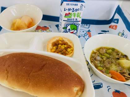 今日の献立は「豚肉と野菜のカレースープ煮、変わりピザ、ミックスフルーツ(かんづめ)、おさつパン、牛乳」でした。ピザは、イタリア南部ナポリ地方の料理で、イタリアでは「ピッツァ」とも呼ばれています。小麦粉とイーストで作ったピザ生地に好みの具をのせ、オーブンで焼いた料理です。