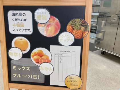 今日のデザートは、ミックスフルーツ(かんづめ)でした。国内産のくだものが4種類(黄桃・パインアップル・和なし・みかん)入っています。