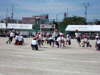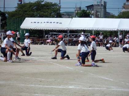 3・4年生による集団演技「We never give up!]。なわとびを使って全員で表現しました。様々な体型や動きを組み入れてがんばっていました。