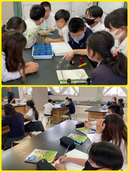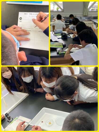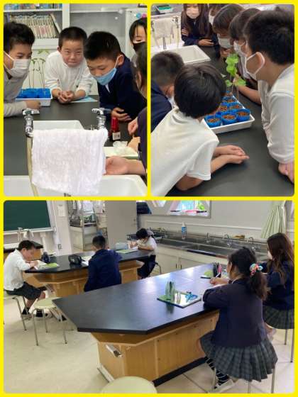 5年生は理科で、発芽する前と後で、子葉の養分にどのような変化があるのか、予想をたててからヨウ素液につけて確かめました。発芽と養分の関係がよく分かったと思います。