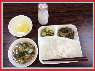 9月11日(金)、今日の献立は、プルコギ、とっても具だくさんのトックスープ、きゅうりとコーンの甘酢あえ、そして、りんごの缶詰、もちろん、ごはんと牛乳。世界の献立シリーズ・・・という感じでした。とてもおいしく、ぜいたくな給食でした。おいしい給食を作っていただいた調理員さんに感謝!!です。