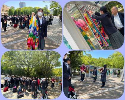 やたなか小中一貫校で平和を願って折った折鶴を奉納し、と黙祷をしました。