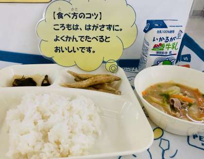 今日の献立は「きびなごてんぷら、豚汁、わかたけ煮、ごはん、牛乳」でした。きびなごは、体長が10cmぐらいの小さな魚です。あたたかい海を好み、春から初夏にかけて、卵を産むために日本の海岸近くにやってきます。この時期のきびなごは、脂がのっておいしいと言われています。