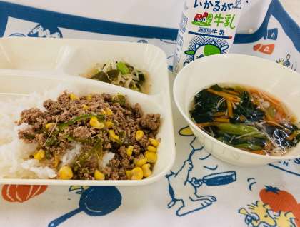 今日の献立は「3色丼、3色スープ、3色すのもの、牛乳」でした。阿倍野区丸山小学校の、昨年度6年1組の児童が考えた献立です。