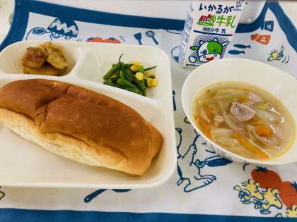 今日の献立は「鶏肉のカレー風味焼き、てぼ豆のスープ、さんどまめとコーンのサラダ、おさつパン、牛乳」でした。