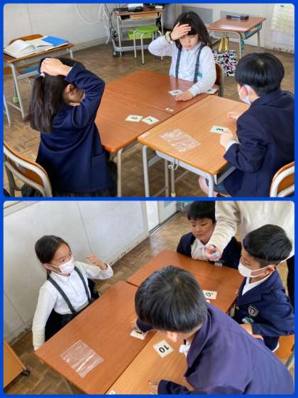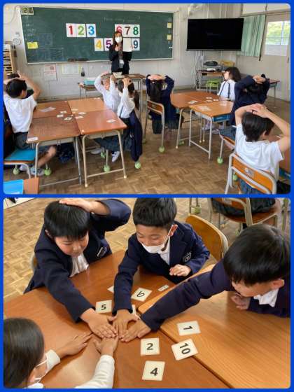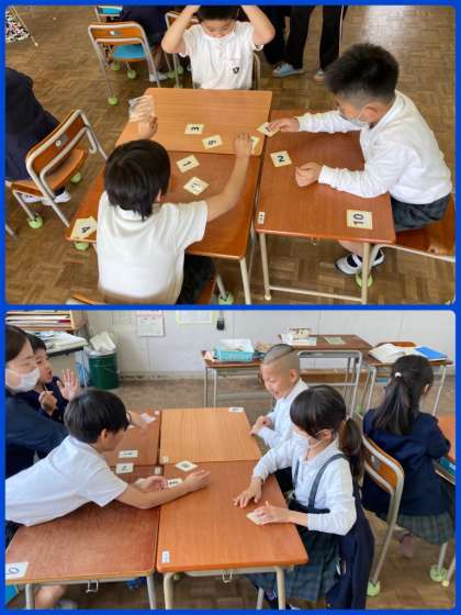 2年生は外国語活動で、いくつあるかを友だちに尋ねる言い方を学習しました。C-NET(外国人講師)の先生といっしょに、楽しく活動している様子が見られます。班でのカードゲームも、しっかりと英語を聞きとりながら、大変盛り上がりました。