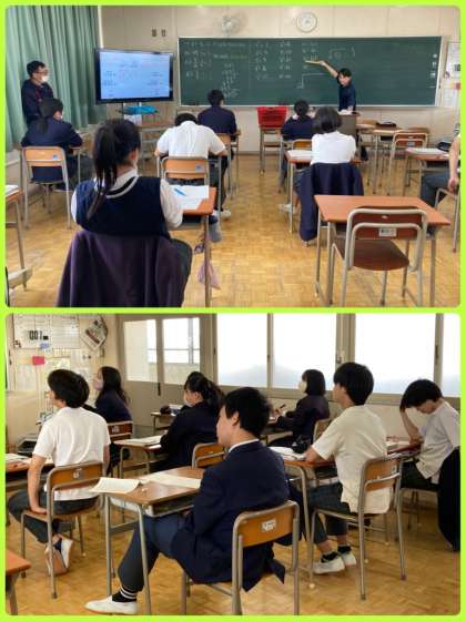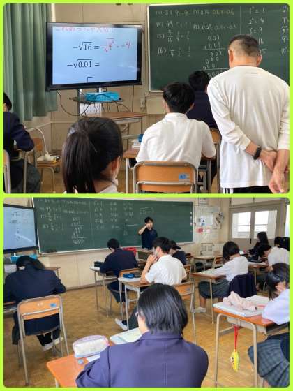 9年生は数学で、ルートを使った様々なパターンの問題を解いていきました。大切なポイントを先生と確認しながら、理解を深めました。