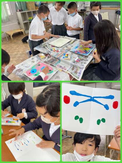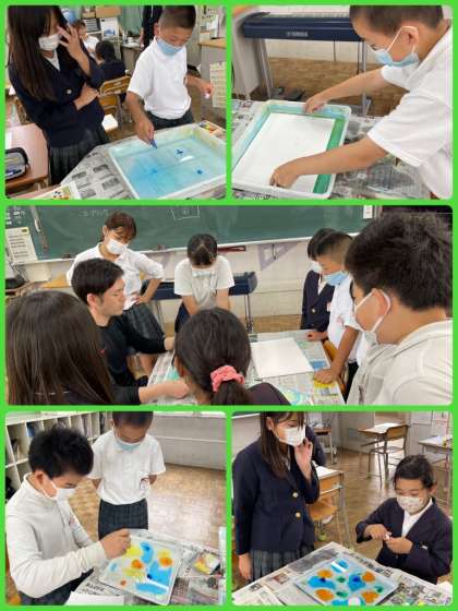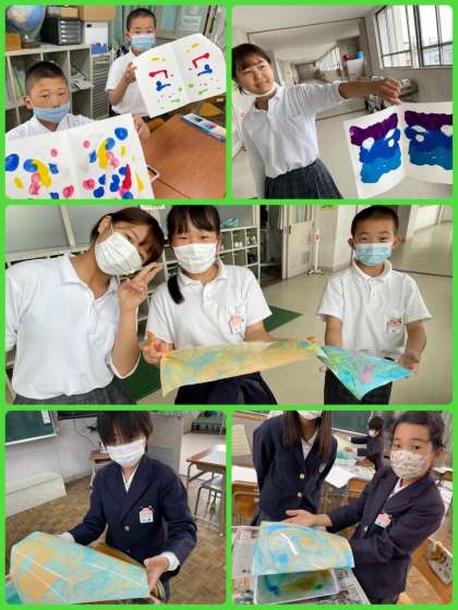 5年生は図工の学習で、いろいろな技法を学びました。デカルコマニーでは、好きな場所に絵の具を塗りつけた紙を半分に折り、絵の具を転写させて、作品に変化を加えました。マーブリングでは、絵の具を垂らしてマーブル模様を作って、紙に写し取っていきました。