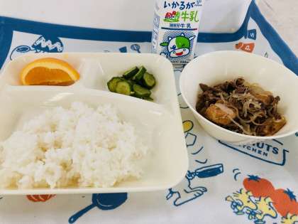今日の献立は「すき焼き煮、きゅうりのしょうがづけ、オレンジ、ごはん、牛乳、中学校:焼きのり」でした。