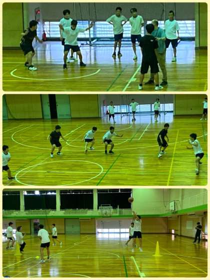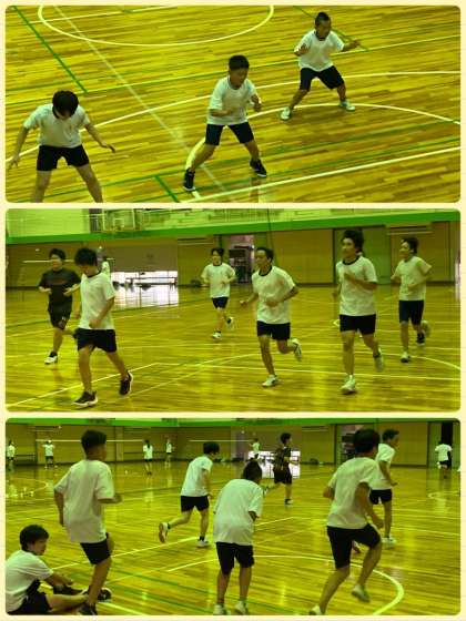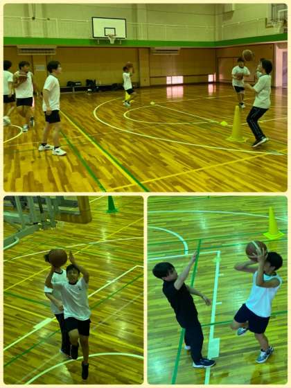 バスケットボール部は小学生もたくさん入部し、様々な形の練習に取り組んでいます。ボールを使う練習以外にも、フットワークトレーニングで下半身を鍛えながら、相手に当たり負けしない強い身体をつくれるようフィジカルトレーニングにのぞんでいます。