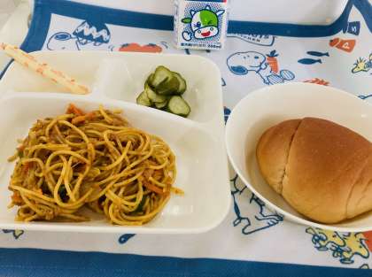 今日の献立は「カレースパゲッティ、きゅうりのピクルス、棒チーズ、1/2黒糖パン、牛乳」でした。