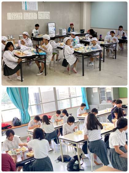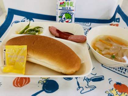 今日の献立は「ウインナーのケチャップソース、スープ、キャベツとさんどまめのサラダ、コッペパン、アプリコットジャム、牛乳、中学校:発酵乳」でした。