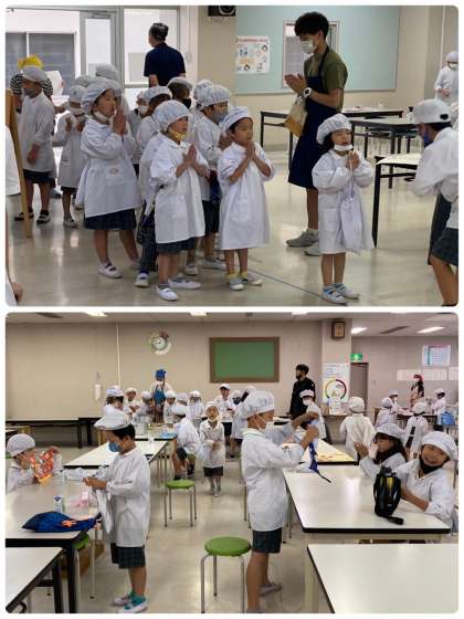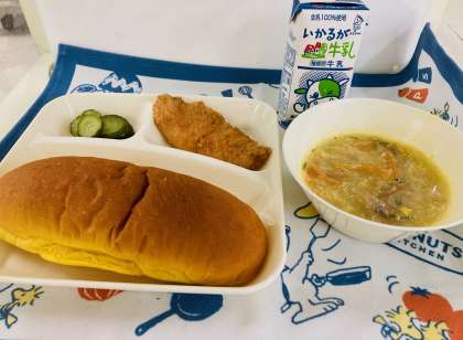 今日の献立は「サーモンフライ、豆乳スープ、きゅうりのバジル風味サラダ、パンプキンパン、牛乳」でした。豆乳は、主に体をつくるもとになる赤のグループの食べ物で、たんぱく質がたくさん含まれています。大豆の加工食品の一つです。
