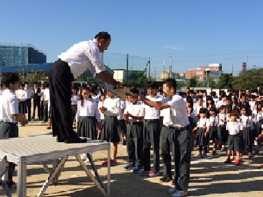 9月20日(日)に行われた「大阪市中学校生徒理科研究発表会」に、夏休みに作成してくれた『理科の自由研究』を出展しました。今日の全校朝会で、その自由研究に対していただいた表彰状を渡しました。それぞれ工夫して作成したのがわかる自由研究でした。これからも、いろいろなことに興味を持ち、学習を深めてほしいと思っています。