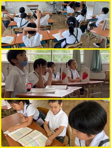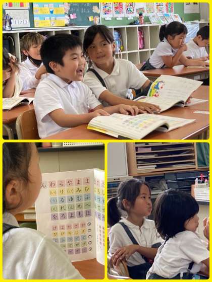 1年生は、この1学期にひらがなを習得しました。この日は、口のあけ方などの共通点を再確認しました。みんな大きな声で発音しながら、復習していきました。