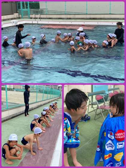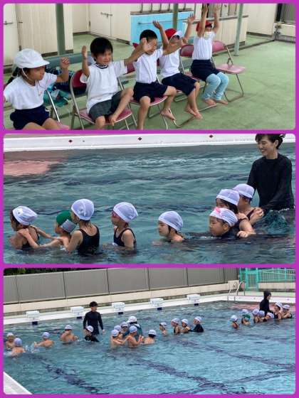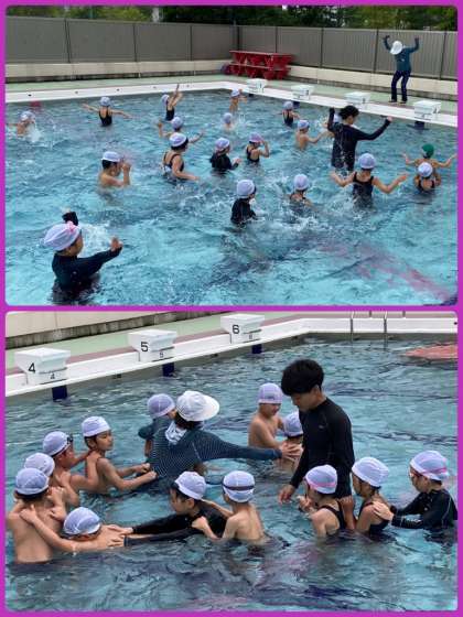 1・2年生の水泳の様子です。1年生も大きなプールに少しずつ慣れてきています。水の中にもぐったり、動物になりきったり、いろいろなことに挑戦中です。2年生は、見本をみせてあげながら自分たちの発展学習にもつなげています。