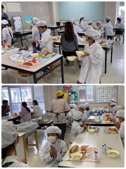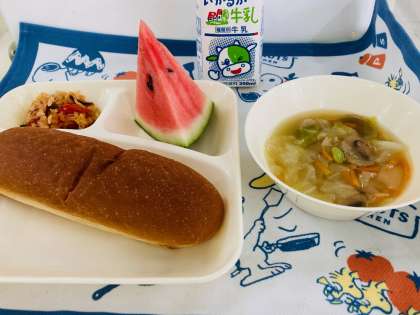 今日の献立は「パエリア、ウインナーとキャベツのスープ、すいか、黒糖パン、牛乳」でした。