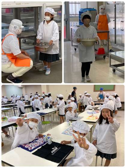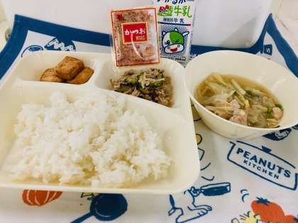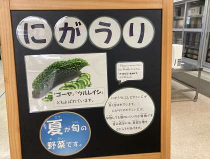 今日の献立は「ゴーヤチャンプルー、五目汁、あつあげのしょうがじょうゆかけ、ごはん、牛乳」でした。「チャンプルー」とは沖縄の方言で「ごちゃまぜ」という意味で、いろいろな食材をいためた料理です。今日の給食は、夏が旬の野菜「にがうり(ゴーヤ)」を使ったゴーヤチャンプルーでした。にがうり(ゴーヤ)には、ビタミンCが多く含まれています。