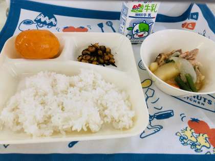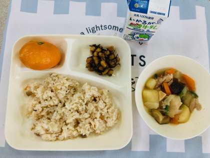 今日の献立は「鶏肉と野菜の煮もの、ひじき豆、冷凍みかん、ごはん、中学校:かやくご飯、牛乳」でした。