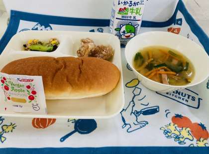 今日の献立は「鶏肉のからあげ、とうがんの中華スープ、ツナとチンゲンサイのいためもの、コッペパン、りんごジャム、牛乳」でした。
