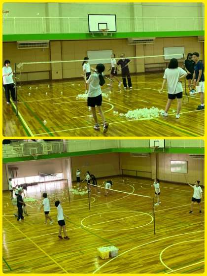 この夏休み、バドミントン部は大会も経験して、各自のレベルアップへ目標を持ちながら取り組んでいます。自分に足りない技術を補えるよう、部活動指導員や先生たちに助言をもらいながらがんばります。