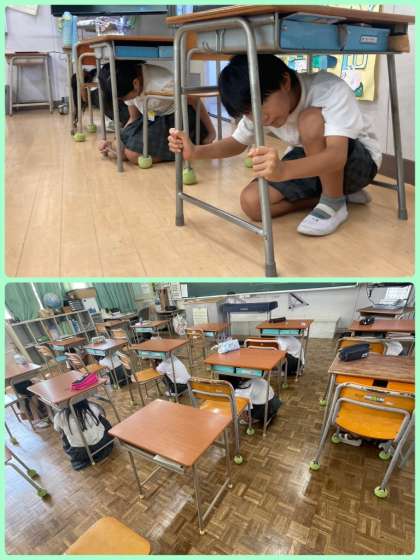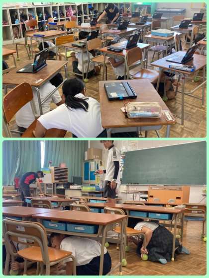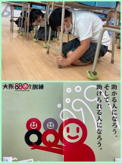 本日13時30分より、大阪府一斉の880万人訓練がありました。放送をしっかり聞き、机の下に隠れて頭を守りました。実際に災害が起きた時には、冷静な行動が難しくなります。日頃からの備えをして、あわてることなく自分の命を守れるようにしましょう。