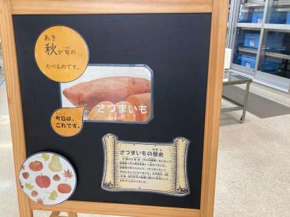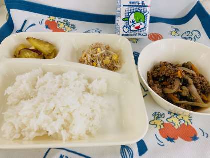 今日の献立は「マーボーなす、ツナと野菜のいためもの、焼きさつまいもの甘みつかけ、ごはん、牛乳」でした。食べ物には、栄養価が高く、たくさんとれて、おいしく食べられる旬があります。秋においしい食べ物には、さんま、さつまいも、くり、さといも、きのこ、ぶどう、かきなどがあります。