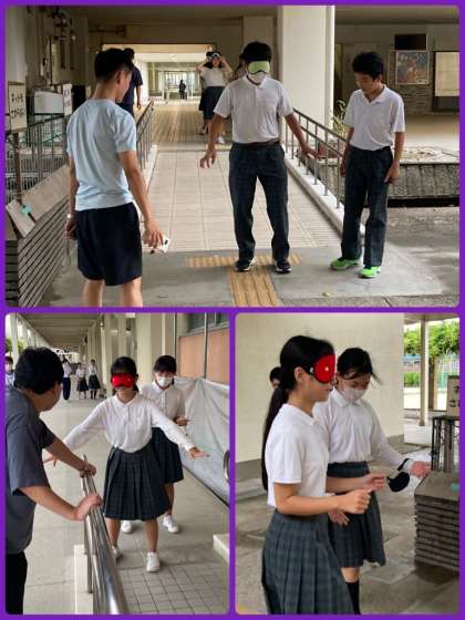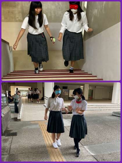 視覚障がいをテーマに、視覚に障がいのある方が普段どのように生活しているのか知るため、実際にアイマスクをして普段歩きなれた校内を歩いてみるという体験をしました。ペアの生徒から指示を聞きながら、おそるおそる歩いていました。周りの人の支えや思いやりの重要性を、あらためて理解できたと思います。