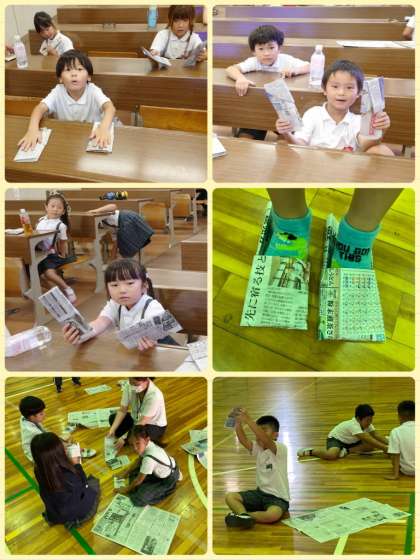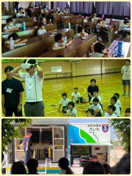 1〜3年生は新聞紙を使い、災害時に使えるスリッパ作りをしました。東住吉区役所の方々の説明を聞きながら、丁寧に折り重ねて完成させました。VR体験では、先生の画面で見える地震発生時の様子を共有し、あらためて地震の怖さを確認できました。