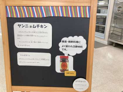 ヤンニョムチキンは、油で揚げた鶏肉に「ヤンニョム」という甘辛いタレをからめて作ります。ヤンニョムとは、コチジャンやしょうゆ、ごま油などを混ぜ合わせた韓国・朝鮮料理に使われる調味料の総称です。今日の給食では、コチジャン、こいくちしょうゆ、ケチャップ、料理酒、みりんで作ったタレを揚げた鶏肉にからめています。